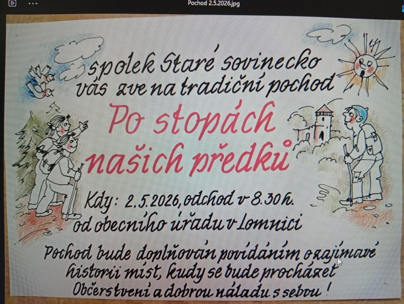 Stalo se tradicí, že 1.května organizuje naše sružení Staré sovinecko, společně s obecními úřady Lomnice, Ryžoviště a Jiříkov přespolní pochod "Po stopách našich předků". Nebylo tomu jinak ani v letošním roce, kdy jsme vyrazili již posedmé,tentokráte s mezinárodní účastí, protože v našem pochodu šla rodina bývalých občanů Lomnice, Kolbových z Německa. Jsme rádi,že se pochodu zúčastňuje stále početnější skupina lidí a to všech věkových kategorií, což dokladují naše pořízené snímky z akce.Pochod je vždy zpestřen vlastivědným a historickým povídáním člena našeho sdružení ing. Fr. Rechtorika .A tak nám nezbývá, než za všechny organizátory akce vyjádřit poděkování všem těm, kteří se i přes nestálé počasí zúčastnili a svoji přítomností tak ocenili naši práci.